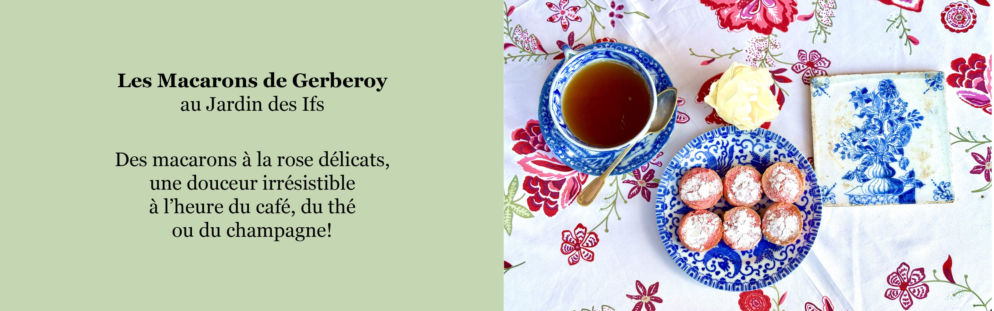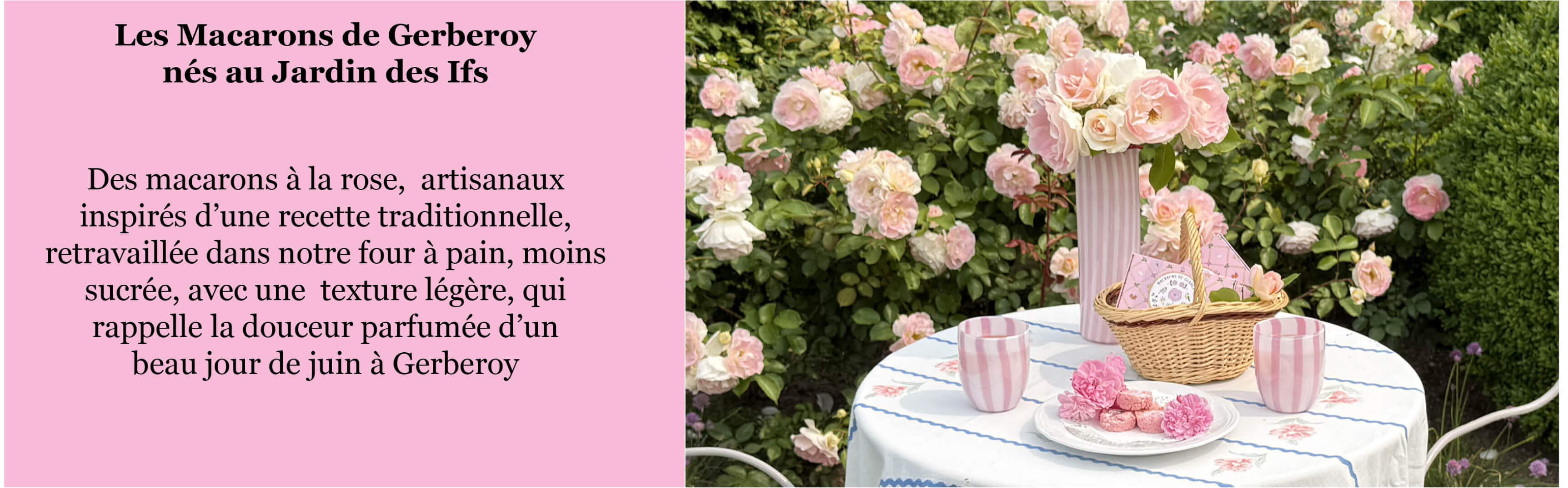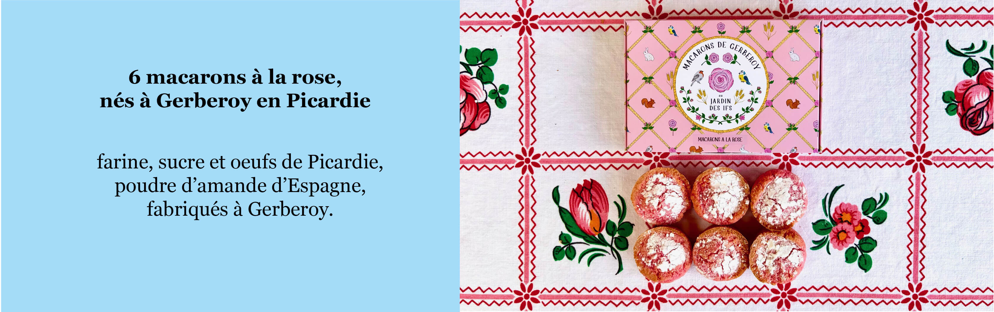 6 macarons à la rose, traditionnels, artisanaux inspirés d’une recette du 13e, retravaillée dans notre four à pain, dans une forme plus contemporaine, moins sucrée, avec une texture plus légère, qui rappelle la douceur parfumée d’un beau jour de juin à Gerberoy.